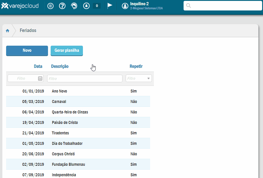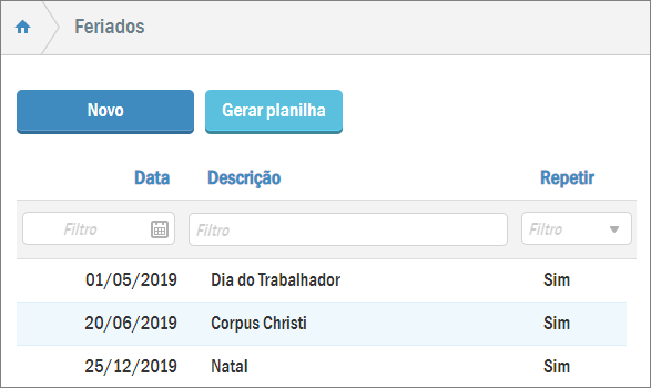 Na sequência, será exibido os feriados já cadastrados no sistema.