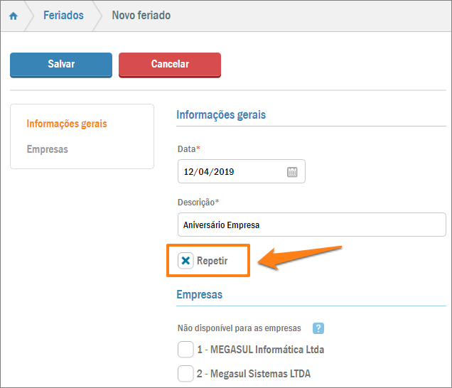 A opção Repetir, só deve ser marcada se você desejar repetir esse feriado para o próximo ano.