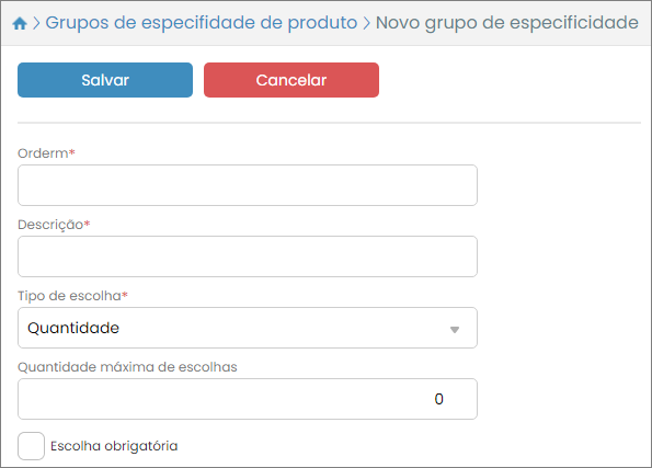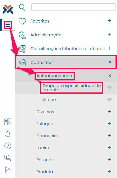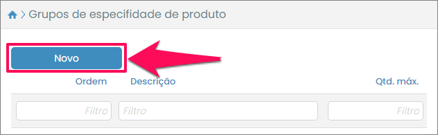 Para iniciar o cadastro de grupos de especificidade acesse: Menu > Cadastros > Autoatendimento > Grupo de especificidade de produto.