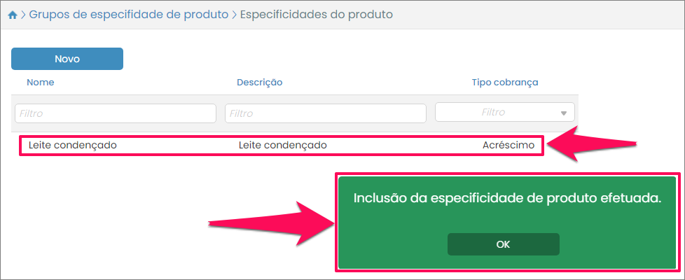 Para inserir mais itens neste grupo de especificidade basta pressionar o botão Novo e repetir o processo.