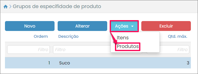 Quando um grupo de especificidade for criado ele não será automaticamente atrelado a produto nenhum. Para inserir este grupo de especificidade a um ou mais produtos você deve, na listagem de grupos, selecionar aquele que você deseja vincular. Então, clique em: Ações > Produtos.