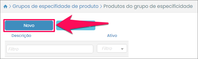 Será aberta a listagem de produtos vinculados ao grupo em questão. Caso o grupo seja novo a lista estará vazia. Para vincular um produto pressione o botão Novo.