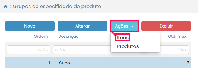 Para isso, na listagem de grupos, selecione o grupo em questão e clique em: Ações > Itens.
