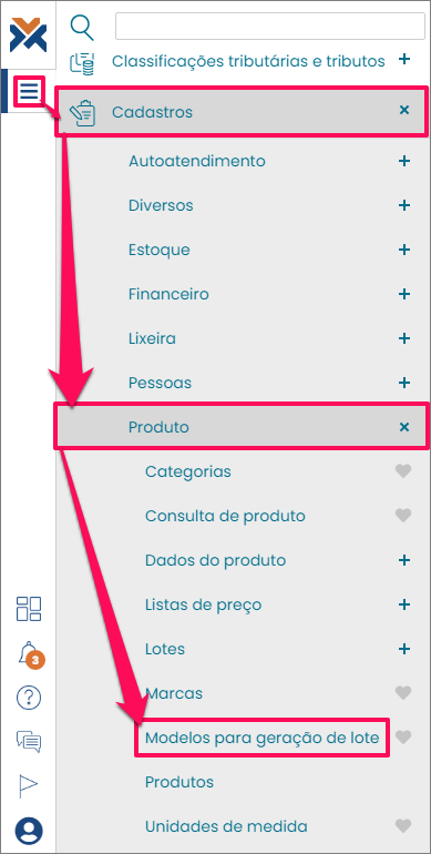 Para cadastrar um novo modelo para geração de lote, acesse o menu do VarejoCloud > Cadastros > Produto > Modelos para geração de lote:
