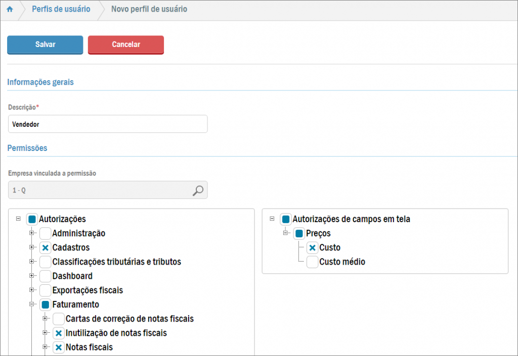 Nela, preencha a Descrição do novo perfil e, na sequência, o sistema informa para qual empresa as permissões abaixo serão válidas (de acordo com a empresa do usuário logado no momento).