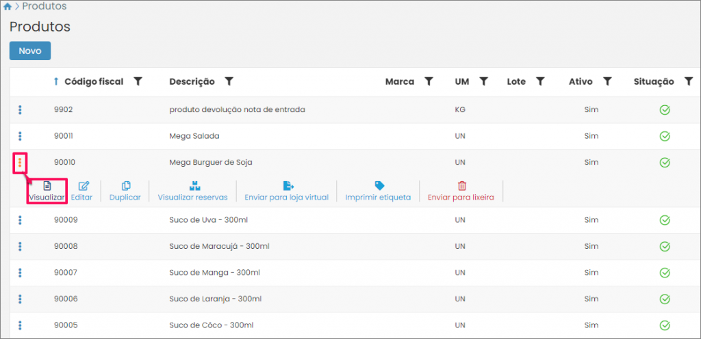 Desta maneira você verá a lista de produtos já cadastrados no sistema. Clique no botão com três pontos ao lado do item para o qual você deseja cadastrar os produtos complementares. Na sequência pressione o botão Visualizar.