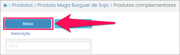 Serão listados os produtos complementares para o item em questão. No nosso exemplo a listagem ainda está vazia. Para adicionar um produto complementar pressione o botão Novo.