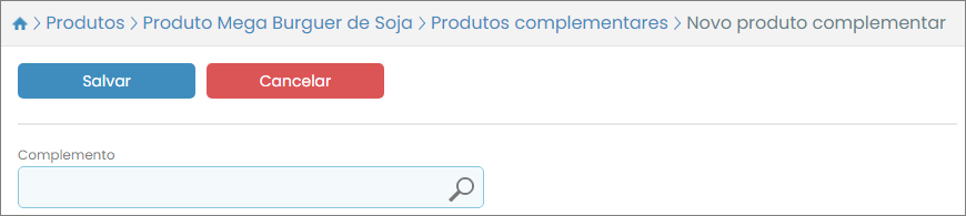 Será aberta a tela de inserção de produto complementar. Este formulário é muito simples e conta com apenas um campo. Basta selecionar outro produto, já pré-cadastrado, no campo Complemento.