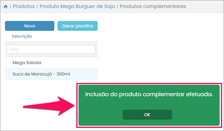 Depois de selecionar o produto que servirá de complemento pressione o botão o Salvar. Assim você retornará à listagem com o novo complemento já cadastrado e com uma mensagem de sucesso na operação.