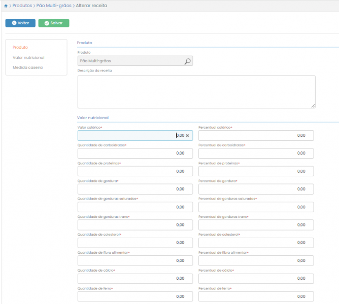 Você será direcionado para a tela de cadastro da receita. Preencha o formulário com as informações de preparo do item.