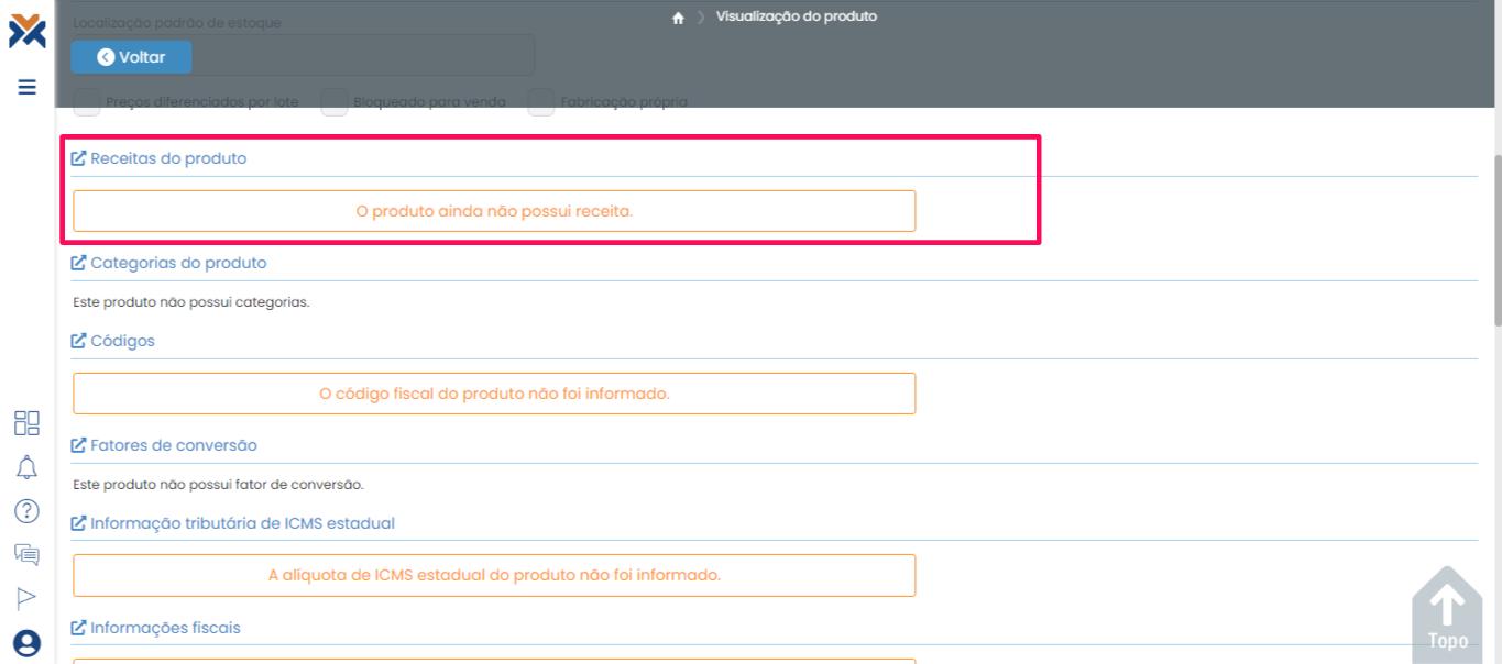 Na tela de visualização do produto, desça a barra de rolagem até a seção Receitas do produto e clique no botão para adicionar a receita.