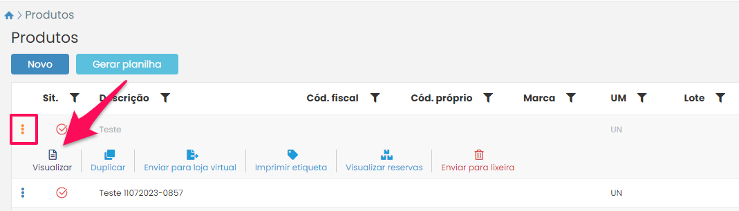 Você será direcionado para a tela de listagem de produtos. Procure pelo produto que você gostaria de informar a receita ou crie um novo produto. Clique aqui para descobrir como criar um novo produto.