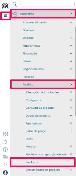 Para cadastrar a receita de um produto, clique no botão para abrir o menu e vá em Cadastros > Produto > Produtos.
