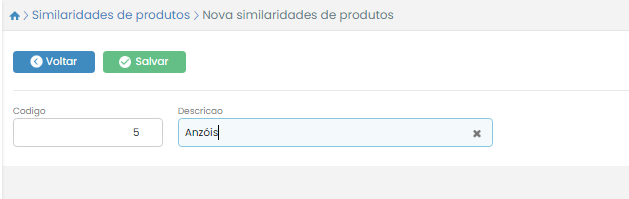 Você será direcionado para a tela de similiaridades, onde deve clicar no botão Novo e preencher o código e a descrição da similaridade. Após isso, clique no botão Salvar.