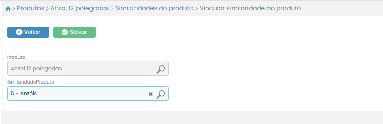 Ao clicar na categoria, será aberta a página de similaridades do produto selecionado. Clique no botão Novo para vincular a similaridade cadastrada. Na nova página que abrirá, digite o código do grupo de similaridade cadastrado e clique no botão Salvar.