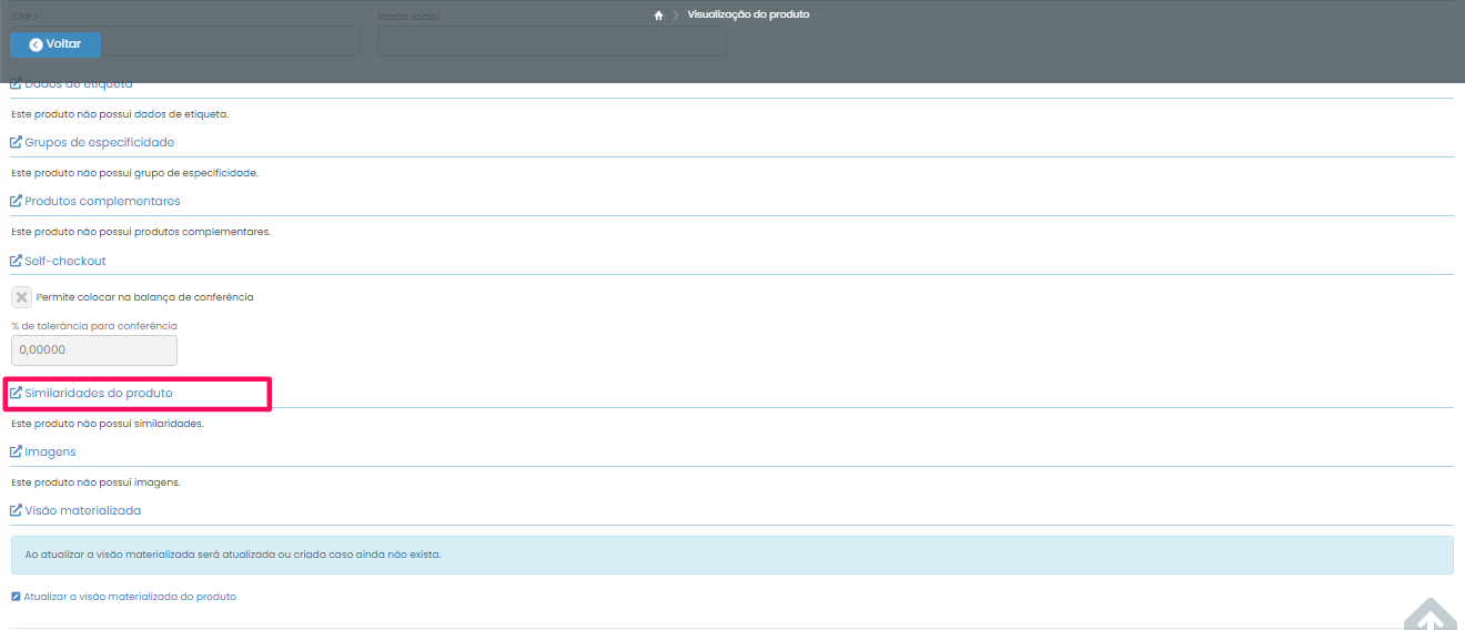 Agora, vá até a guia Cadastros > Produto > Produtos e procure pelo produto que você deseja vincular à similaridade criada. Entre na visualização do produto e desça a barra de rolagem até a categoria “Similaridades do produto“.