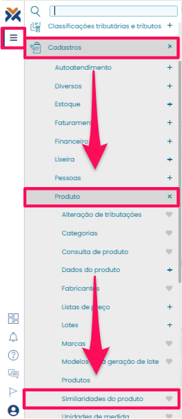 Acesse o sistema do VarejoCloud e clique nas três barras lateriais para abrir o menu. Vá até a guia Cadastros > Produto > Similaridades do produto.