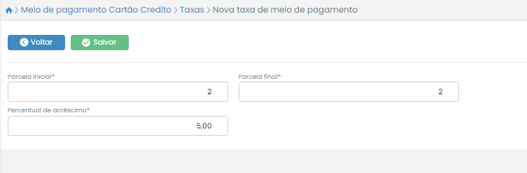Já o campo Parcela final, deve ser preenchido com o número da última parcela em que a taxa será acrescentada.