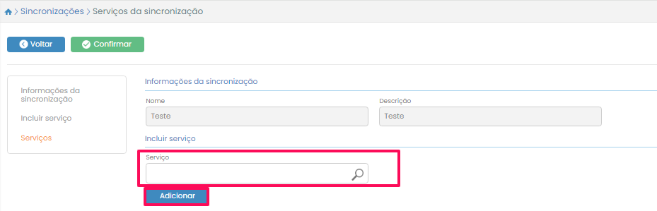 Clique no botão Salvar para finalizar o cadastro. Após isso, procure a sincronização criada na listagem da tela e clique no botão do lado esquerdo. Clique no botão Serviços.