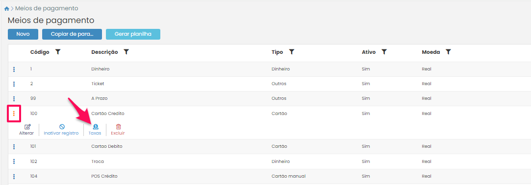 Você será direcionado para a página de meios de pagamento. Procure pelo meio de pagamento que você deseja inserir a taxa e pressione o botão do lado esquerdo. Após isso, clique no botão Taxas.
