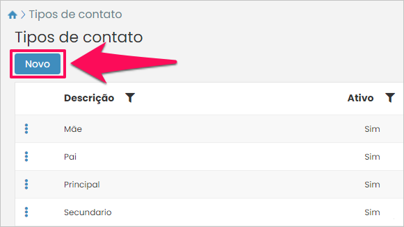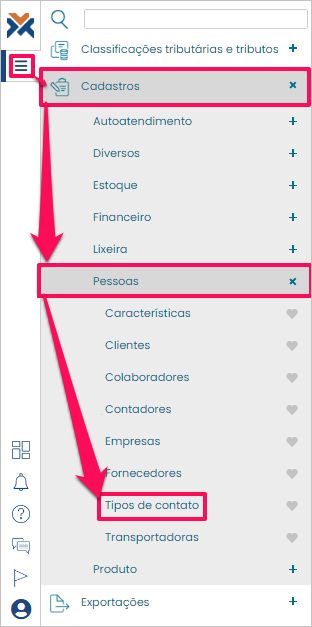 Para cadastrar um tipo de contato o procedimento é simples. Primeiramente, você deve acessar: Menu > Cadastros > Pessoas > Tipos de contato.