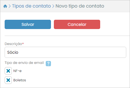Será aberta a tela de cadastro. Basta inserir a descrição do tipo de contato, por exemplo: “Sócio”. Depois, caso desejado, marque a opção de envio de e-mail NF-e e/ou Boletos. Por fim, pressione o botão Salvar.