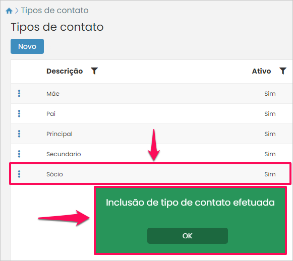 Assim o novo tipo de contato será adicionado à lista de cadastros e o sistema exibirá uma mensagem de sucesso na operação.