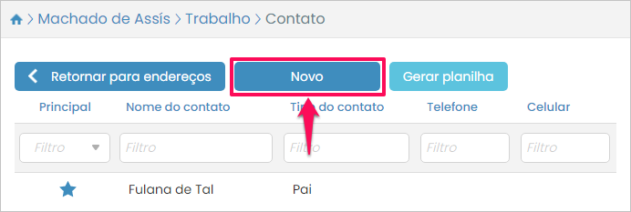 Será exibida a lista de contatos do endereço selecionado. Para adicionar outro pressione o botão Novo.