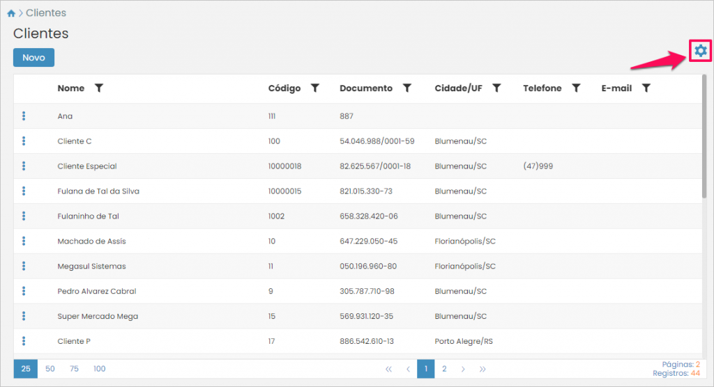 O sistema apresentará a tela de clientes. Antes de mais nada, você pode definir se será ou não obrigatório informar o telefone, o e-mail e o celular do cliente no cadastro. Caso você queira fazer esta definição, clique no botão de configuração no canto superior direito da tela:
