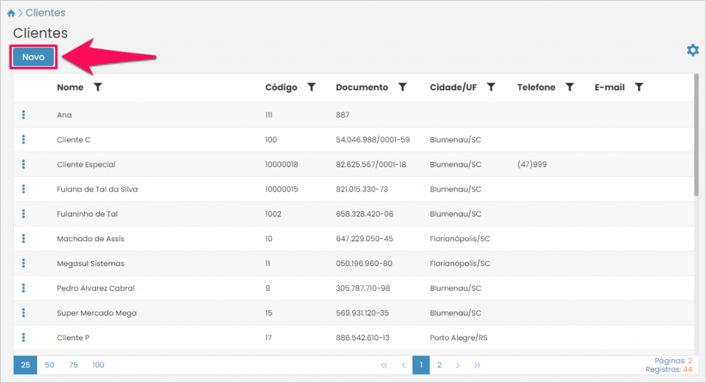 Quando terminar de definir quais campos serão obrigatórios clique no botão Salvar. Você será redirecionado à listagem de clientes. Então, para cadastrar alguém, pressione o botão Novo.