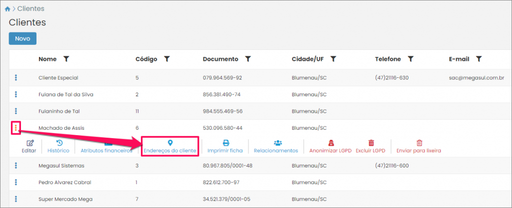 No cadastro inicial você só poderá inserir um endereço para o cliente. Caso você queira ainda adicionar mais endereço(s) clique nos três pontinhos ao lado do cliente na listagem. Depois, pressione o botão Endereços do cliente.