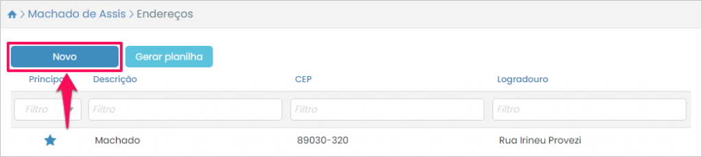 Você verá a listagem de endereços. Para adicionar outro pressione o botão Novo.