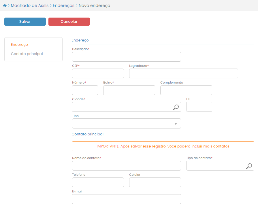 Informe a Descrição deste endereço (algo que o identifique em relação aos demais), CEP, Logradouro, Número, Complemento, Bairro, Cidade, UF. Depois, defina o Nome do contato principal deste cliente, e classifique este Tipo de contato (esses tipos devem ser previamente cadastrados pelo usuário). Por fim, indique o Telefone, Celular e E-mail para contato.
