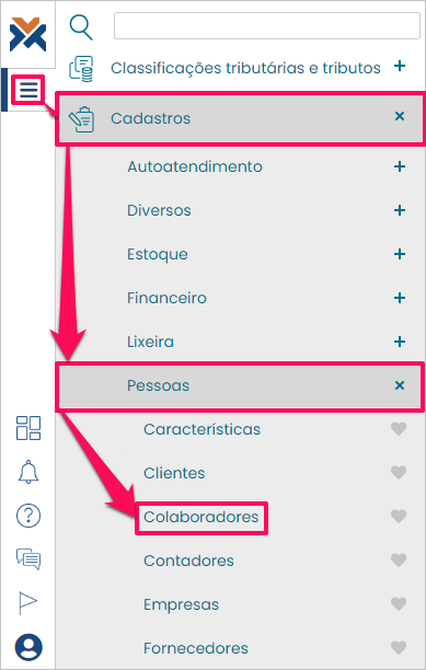 Acesse: Menu > Cadastros > Pessoas > Colaboradores, de acordo com a imagem abaixo: