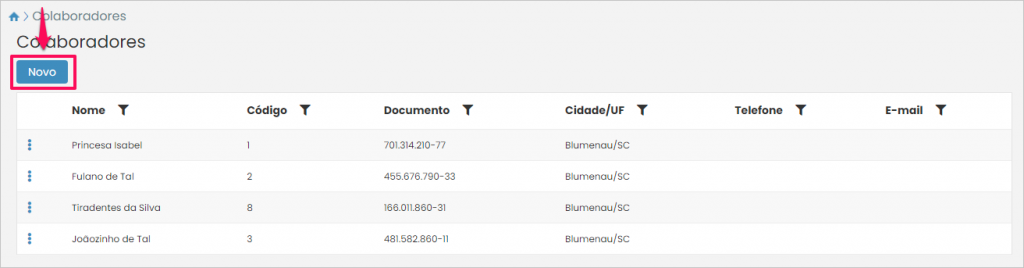 O sistema apresentará a tela de colaboradores. Para incluir um novo cadastro no sistema, clique em Novo: