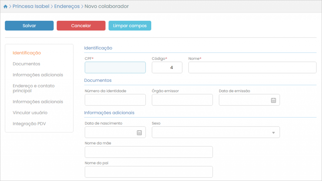 Preencha com o CPF e o Nome do colaborador. Já o Código se refere a um código gerado automaticamente pelo sistema; ele pode ser revisto e ajustado, se necessário.