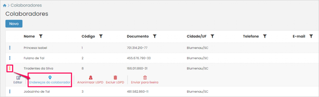No cadastro inicial você só poderá inserir um endereço para o colaborador. Caso você queira ainda adicionar mais endereço(s) clique nos três pontinhos ao lado do nome do colaborador e depois pressione o botão Endereços do colaborador.