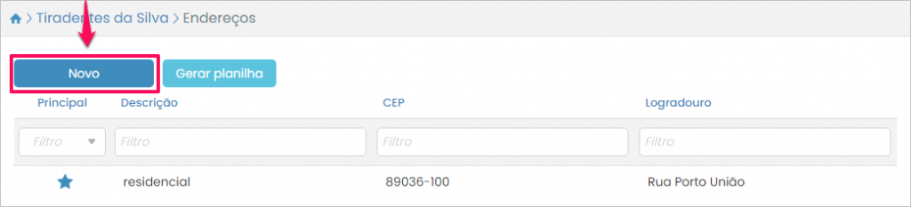 Você verá a listagem de endereços. Para adicionar outro pressione o botão Novo.