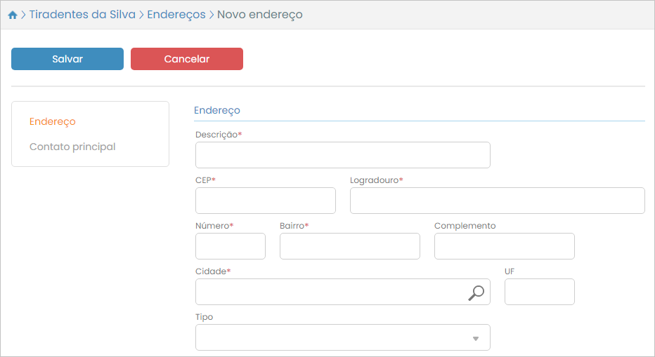 Informe a Descrição deste endereço (algo que o identifique em relação aos demais), CEP, LogradouroNúmeroComplementoBairroCidadeUF. Depois, defina o Nome do contato principal deste cliente, e classifique este Tipo de contato (esses tipos devem ser previamente cadastrados pelo usuário). Por fim, indique o TelefoneCelular e E-mail para contato.