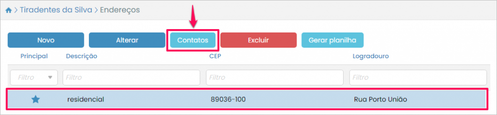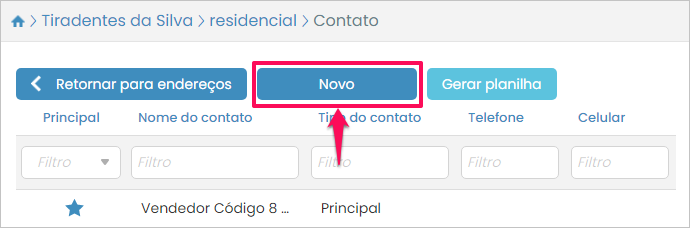 Será exibida a lista de contatos do endereço selecionado. Para adicionar outro pressione o botão Novo.