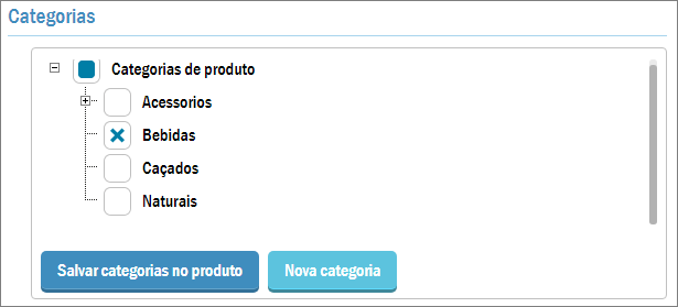 Depois aparece outra guia não obrigatória, a Categorias. Nela você pode definir uma categoria para o produto e depois clicar em Salvar categorias no produto.