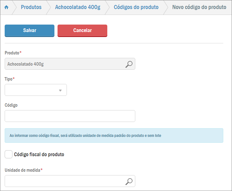 A primeira guia obrigatória que aparecerá nesta tela é a Códigos. Clique no botão Visualizar códigos. Então, você tem a opção de cadastrar um novo código para este produto clicando na opção Novo código. Desta maneira, você entrará na seguinte tela: