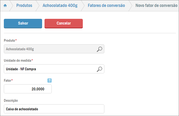 Depois, clique sobre o nome do produto para retornar à tela anterior e retomar a caça às pendências. A guia a seguir é a Fatores de conversão, ela não é obrigatória. Caso julgar necessário, você pode clicar em Visualizar fatores de conversão. Então, pressione o botão Novo fator de conversão. Basta informar a Unidade de Medida, o Fator e a Descrição desta conversão.