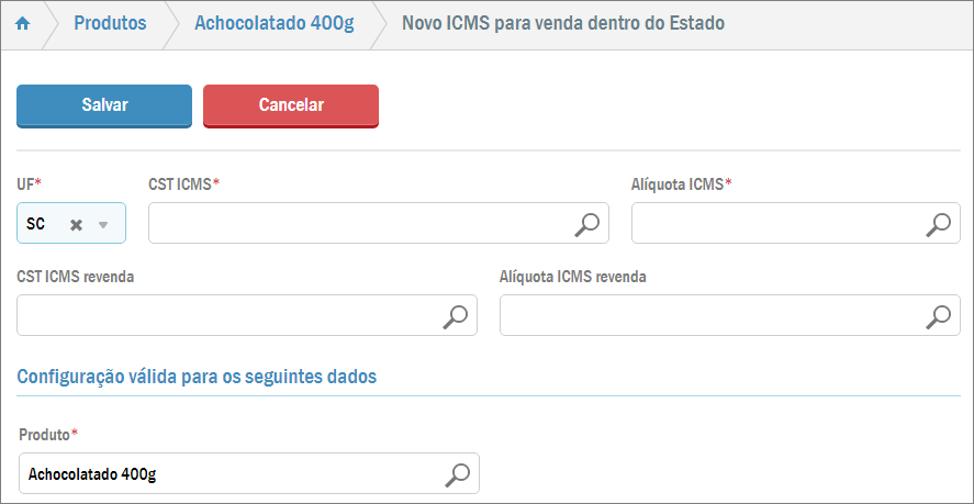 Ao terminar, pressione o botão Salvar e depois clique no nome do produto para mais uma vez retornar à caça por pendências. Assim, você verá que o próximo passo é a guia Informação tributária de ICMS estadual, ali você deve pressionar o botão Informar ICMS estadual, para abrir a seguinte tela: