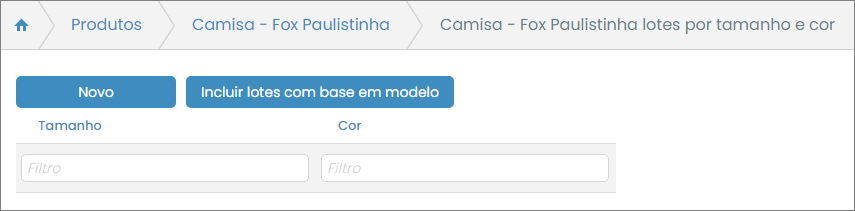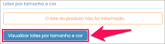 Agora, caso você tenha cadastrado um produto de lote e cor ainda será necessário resolver esta pendência clicando no botão Visualizar lotes por tamanho e cor.