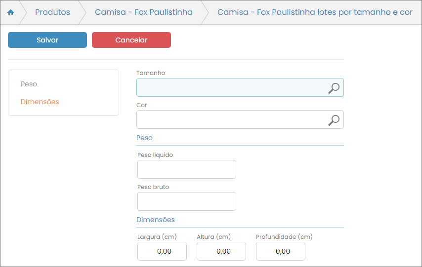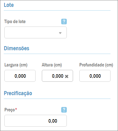 Caso o produto tenha lote preencha o campo Tipo de lote. Na sequência, caso julgar necessário, você pode informar as dimensões do produto. O único campo de preenchimento obrigatório destas últimas guias é o Preço.