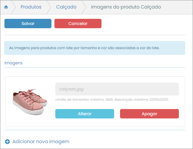 Quando você tiver um produto com lotes de diferentes tamanhos para a mesma cor a imagem será padronizada. Ou seja: se você tiver um calçado bege sendo vendido nos tamanhos 32, 34, 36, 38 e 40, basta cadastrar uma única imagem que ela será automaticamente utilizada para todas estas opções.