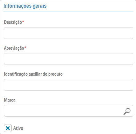 Você pode informar os outros campos se julgar interessante para a sua empresa. A opção Ativo deve permanecer marcada se o produto precisar ser utilizado por qualquer motivo.