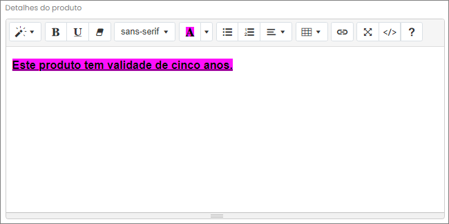 O campo Detalhes do produto serve para adicionar outras informações que você julgar relevantes. Este campo possibilita a inserção de diversos efeitos como: negrito, diferir o tipo de fonte e seu tamanho, sublinhar, pintar o texto de diferentes cores e mais. Estas opções podem ser utilizadas para produtos integrados com a loja virtual.