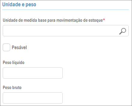 O único campo de preenchimento obrigatório é o Unidade de medida base para movimentação de estoque, preencha-o com a unidade de medida. Caso o produto for pesável marque a respectiva opção e indique o peso no campo Peso líquido e/ou Peso bruto.